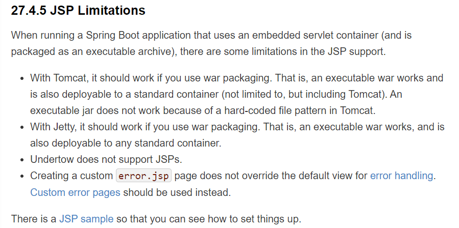 자주사용되는 jsp의 경우 임베디드 서블릿 컨테이너를 사용하는 Spring Boot에서는 제한 사항이 있습니다. 공식문서를 참고해주세요.